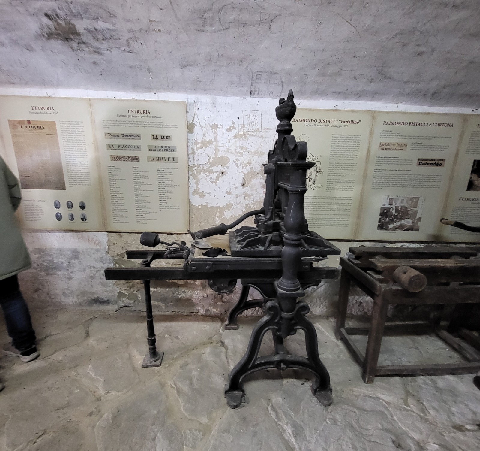 Dopo la funzione religiosa tutti alla volta della Fortezza del Girifalco, per un appuntamento con un autentico pezzo di storia: la vecchia tipografia dell’Etruria. Qui si parla addirittura del torchio dell’Ottocento, utilizzato fino alla morte di Raimondo Bistacchi, detto Farfallino, direttore dell’Etruria dal 1922 al 1973. Davanti a queste macchine si percepisce la fatica del mestiere: il rumore secco della stampa, l’odore dell’inchiostro, la manualità necessaria per comporre ogni singola pagina. Un’epoca che sembra lontanissima e difficile da immaginare, se non fossero rimasti questi segni tangibili di un passato che si può ancora toccare con mano. È lì che si capisce cosa significhi davvero “fare un giornale”: non solo scrivere, ma costruire fisicamente una voce.